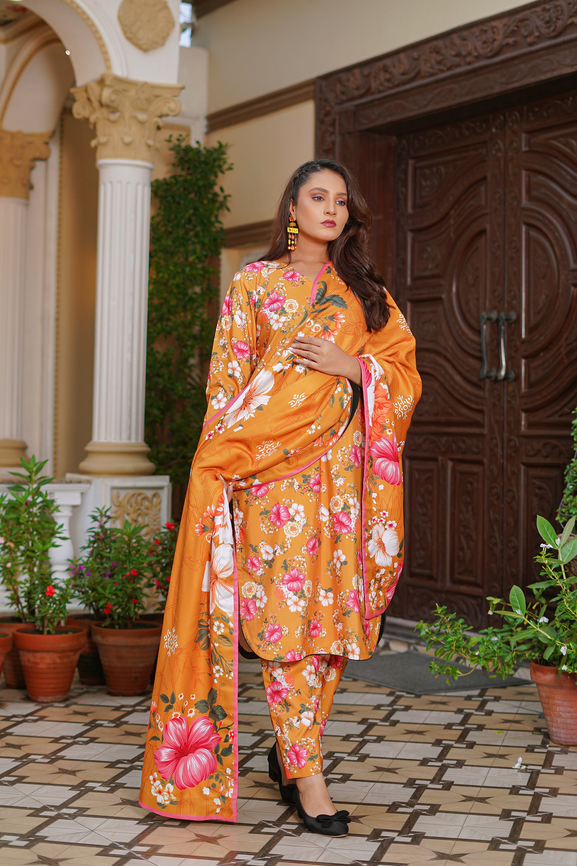- Enhanced with a digitally printed wool shawl, it brings warmth and sophistication, making it an ideal choice for cozy winter evenings in Pakistan.
