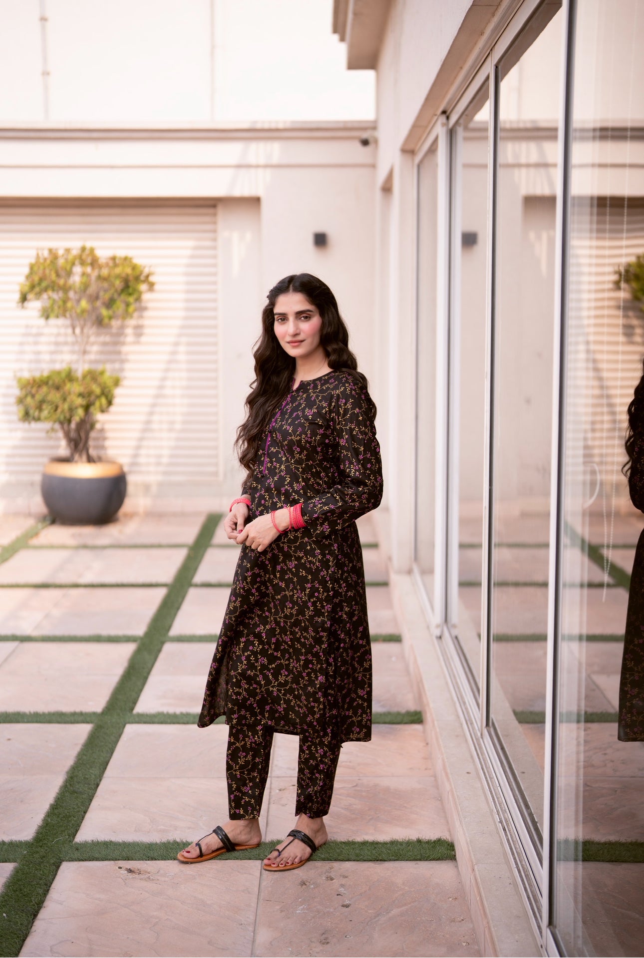 Floral Ember is a charming two-piece dress made with soft black lawn fabric decorated with tiny floral prints in shades of pinkish red and yellow. The colors pop beautifully against the black base, creating a look that’s both elegant and eye-catching — perfect for the warmer season.