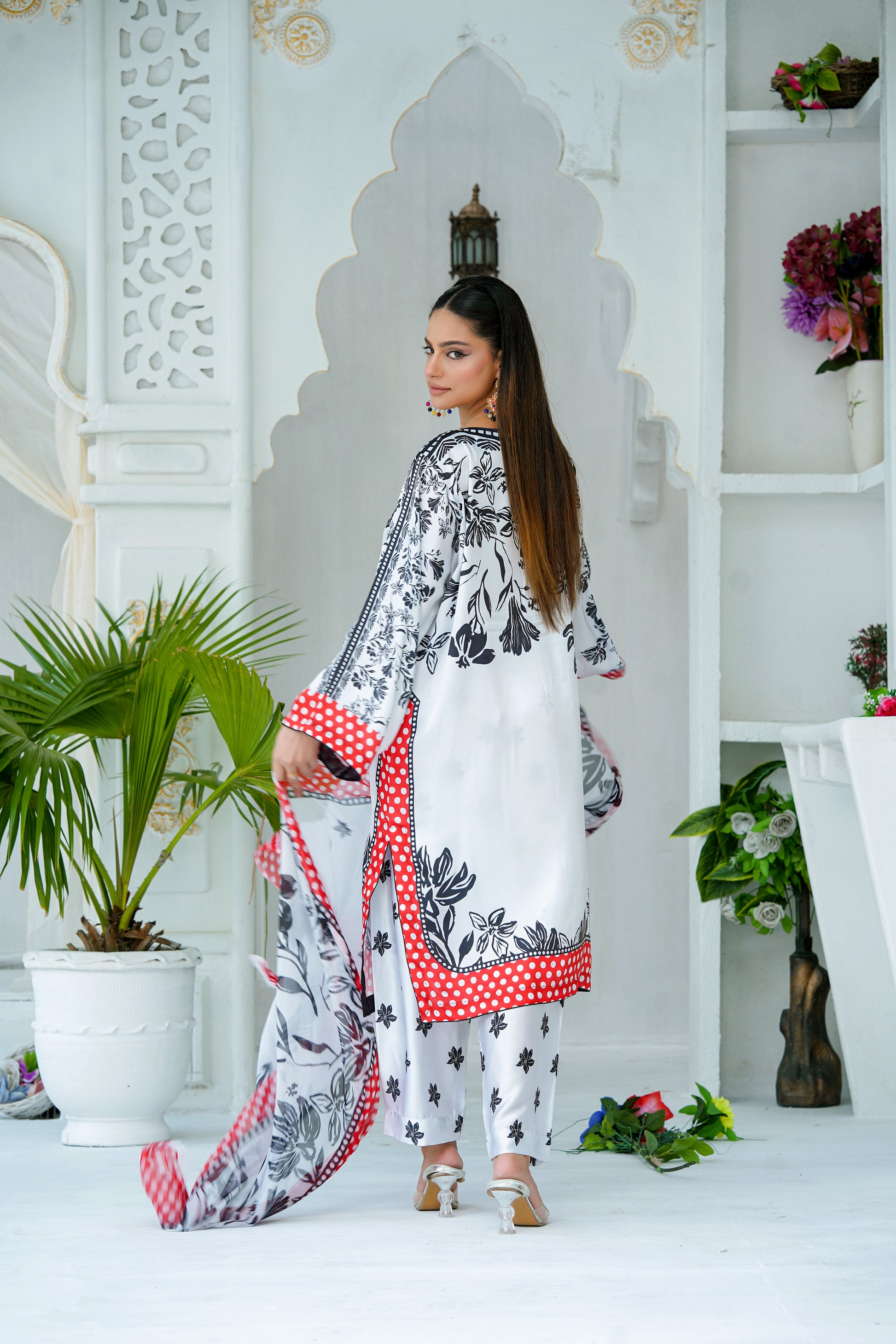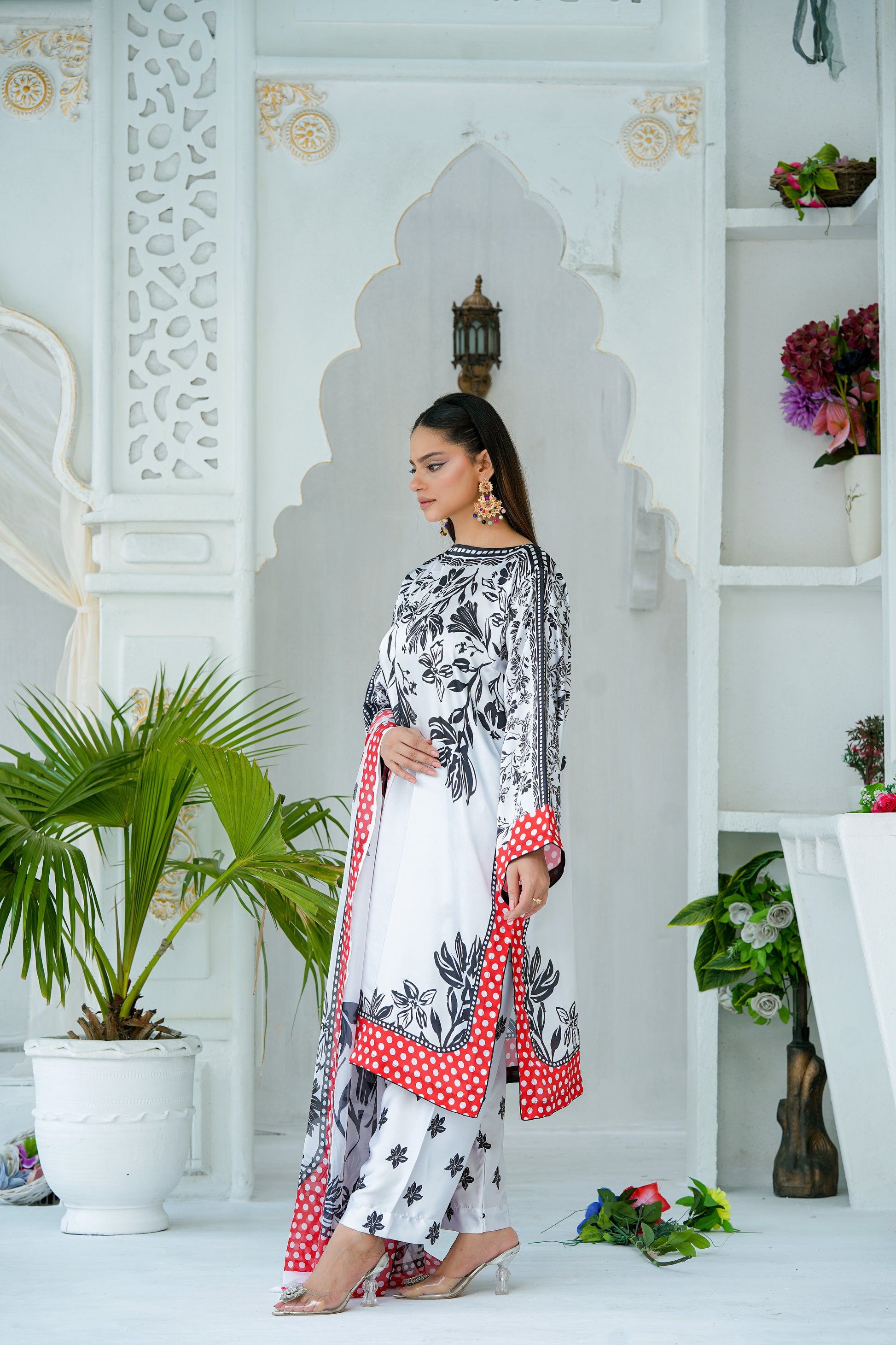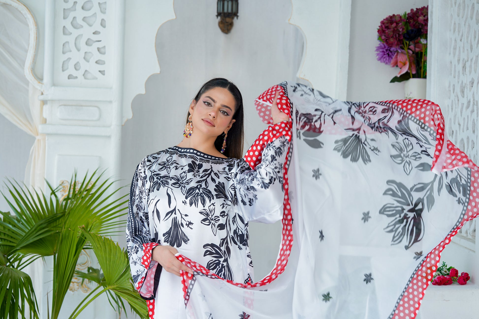Completing the set, the dupatta mirrors the theme in charmeuse silk with flowing prints in black and red. Lightweight and glossy, it ties the whole ensemble together, adding a final touch of drama and finesse.