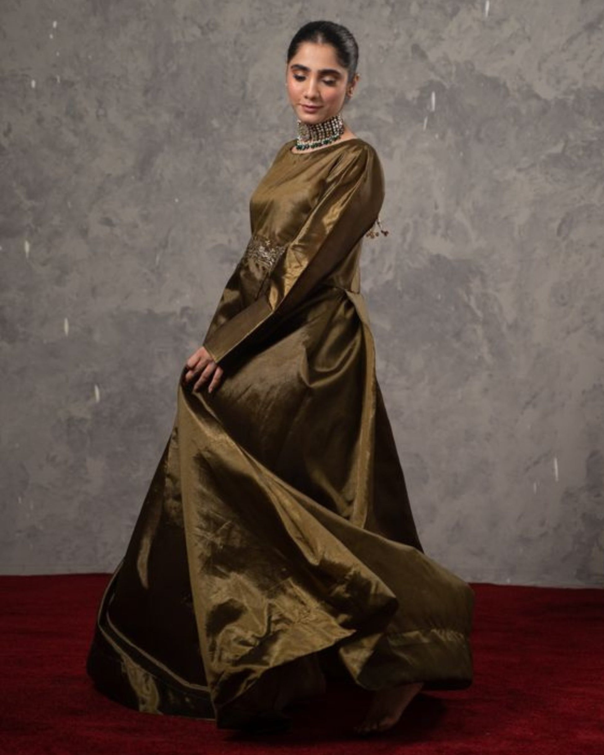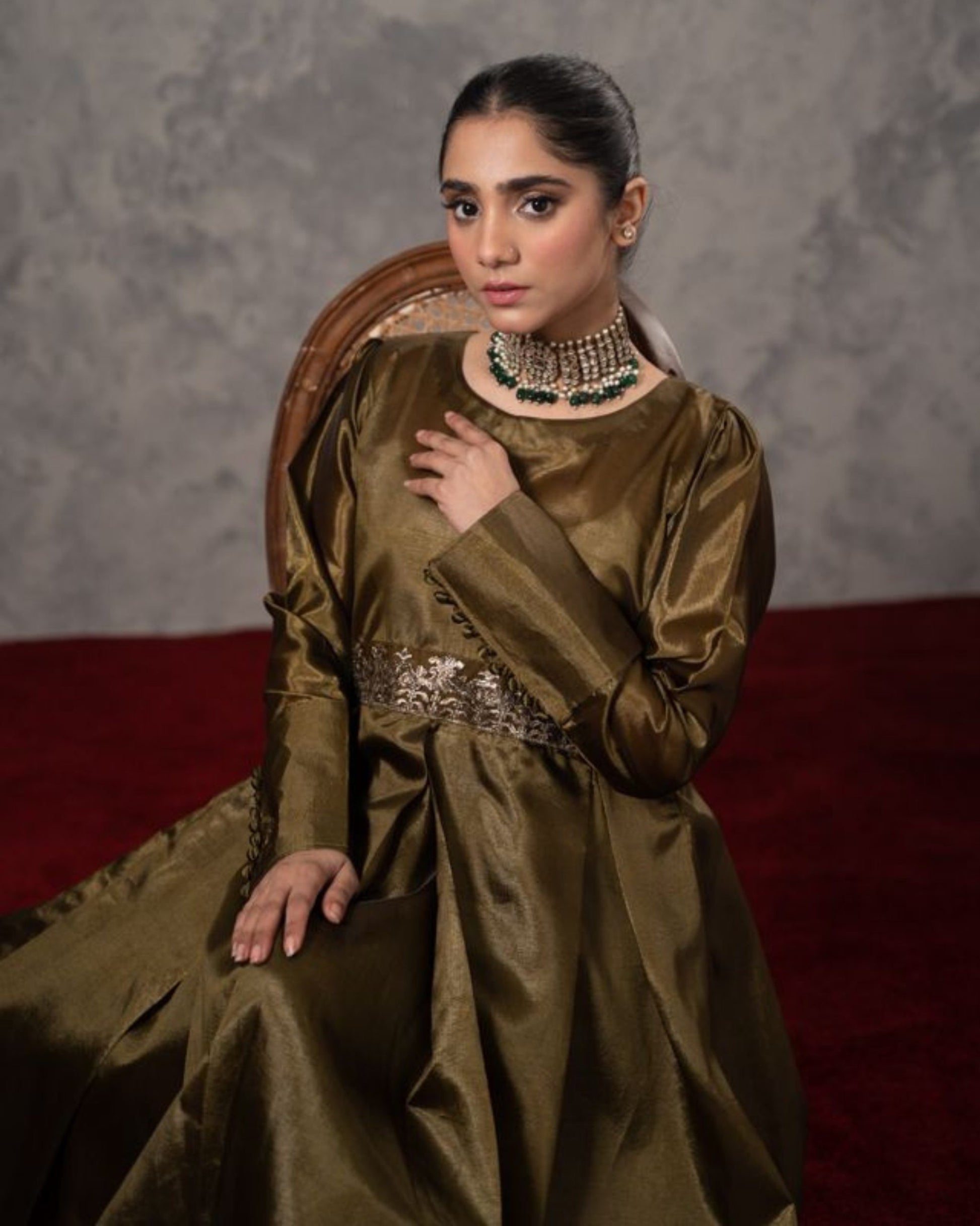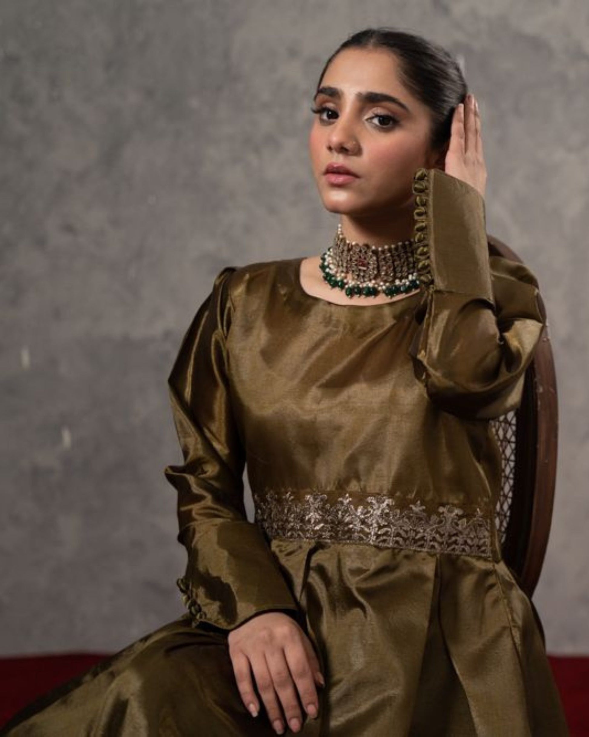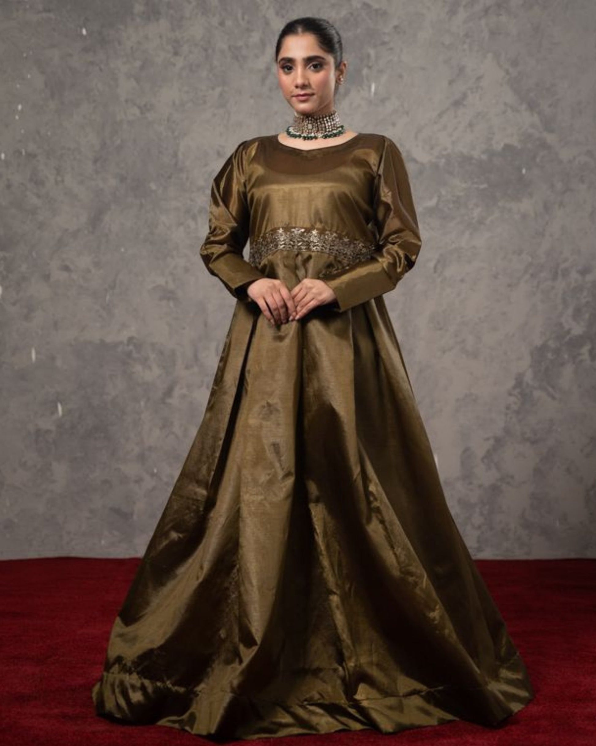 Elevate your wardrobe with Firaaq, a single-piece ensemble from GR that epitomizes sophistication and charm. This olive-green attire, crafted with a luxurious finish, is adorned with intricate embellishments across the waistline, making it a statement of timeless elegance.